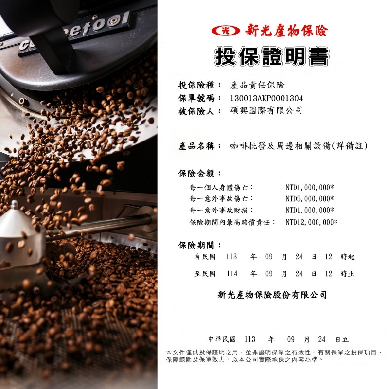 HOFFE COFFEE 每年都會投保 1200萬的產品責任險,給予消費者最大的保障。