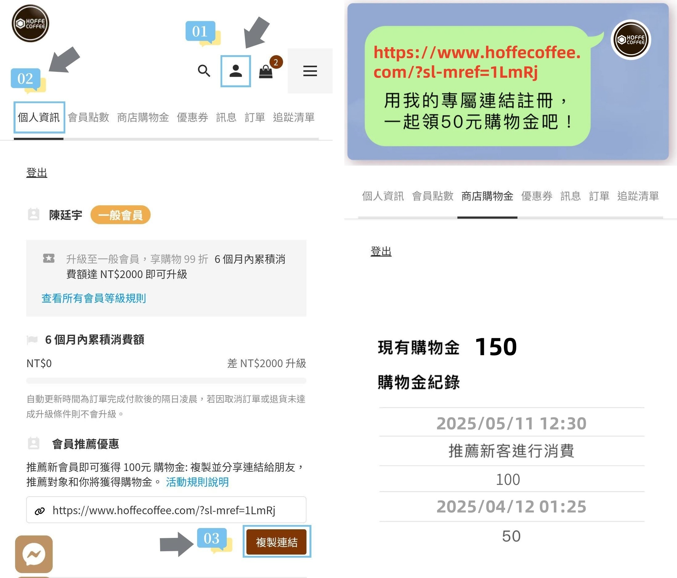 好友透過您提供的【推薦連結】註冊 HOFFE 官網會員,好友就可拿到💲購物金50元