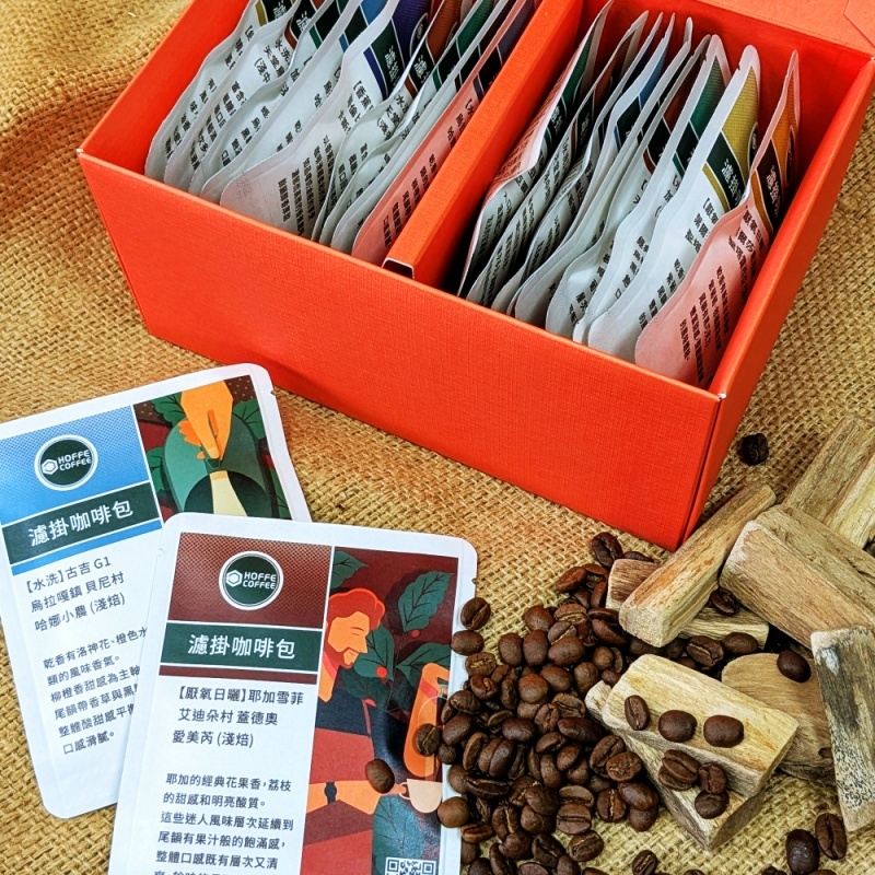 精緻手折禮盒,搭配HOFFE COFFEE 新鮮香醇的綜合濾掛咖啡包,20包裝,足量12g,還有精美提袋。