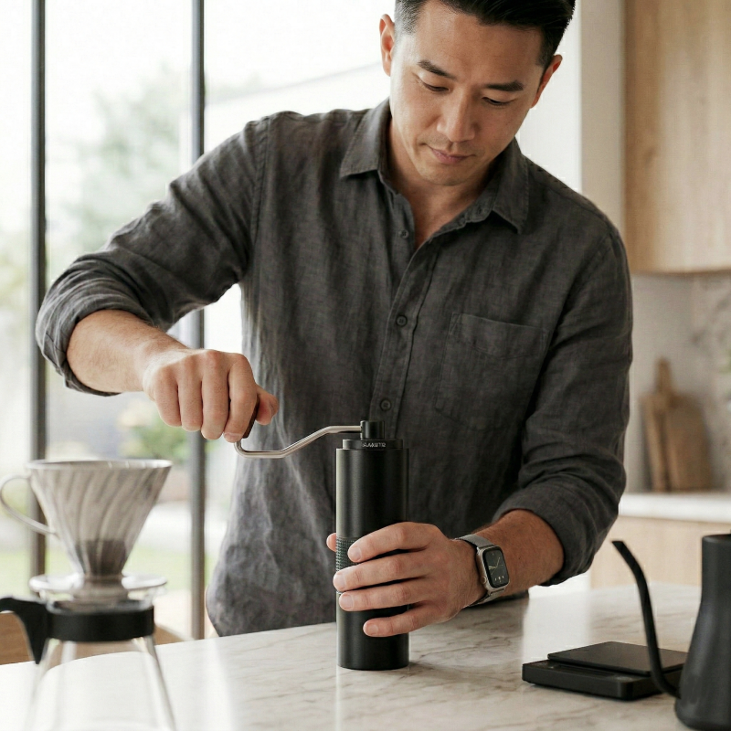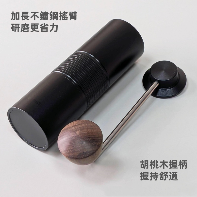 更以全金屬機身、CNC 不鏽鋼錐刀與胡桃木手搖臂設計,打造出兼具手感與實力的職人級手搖磨豆機。