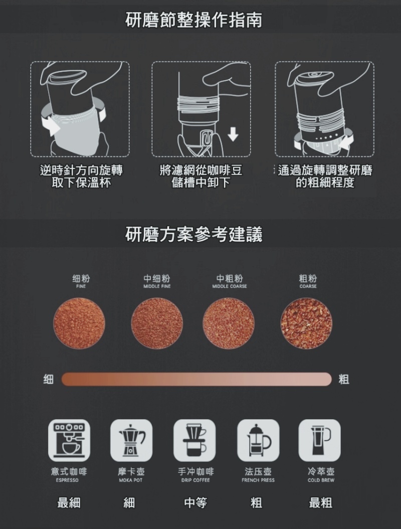 • 電動研磨機、手沖咖啡機與保溫杯合為一體